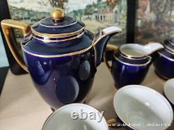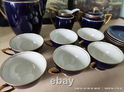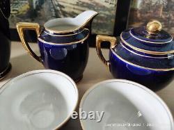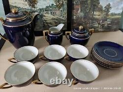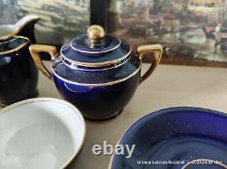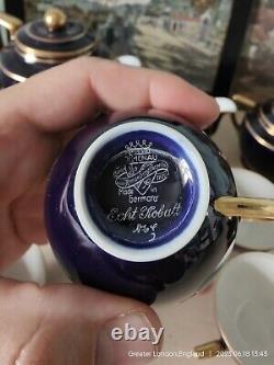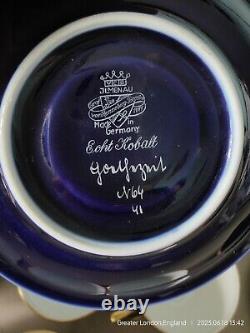 The Jimenau Echt Cobalt Von Henneberg Coffee Set is a vintage collection made in Germany during the 1960s. This set includes a Coffee Cup & Saucer Set and an Espresso Cup, all crafted from blue porcelain with a distinctive design. The brand, Jimenau, is known for its elegant and high-quality tableware products, making this set a unique addition to any coffee lover's collection.