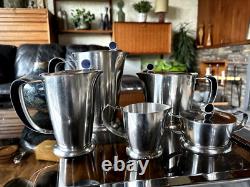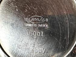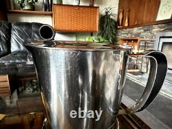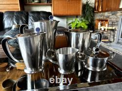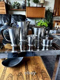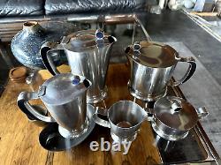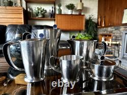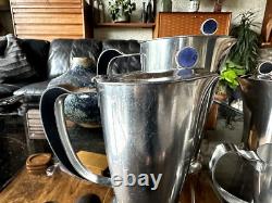 Vintage 1960s Modernist Stainless Steel Coffee / Tea Service By Genie Sweden. These Have Black Inserts In Handles And Knobs Apart From The Hot Water Jug That Has Black Handle And Blue Knob That Has A Small Circle Of Damage. In Very Good Condition With Light Marks And Scratches And Would Benefit From A Detailed Polish. 50cl Hot Water Jug (Blue Knob / Slight Damage).