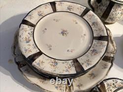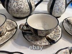 This vintage tea/coffee set from Bavaria includes 22 pieces of bone china in silver gray, blue, and tan. The set includes a teapot, sugar bowl, creamer, and a tea cup and saucer set. The backstamp is printed and the set is considered vintage.