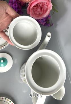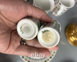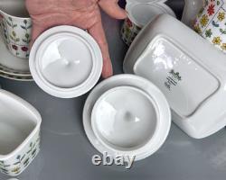 Cups 2.75"H by 2.5" W across the rims. Creamer 2.75"H and 2.5"W across the rim. Sugar Bowl - 3.5" wide and 3"H (tip of knob) or 2H. Coffee pot - 9" H (to the tip of the lid knob), 4 5/8"W across the top rim. Jam jar - 2.75" L by 2.5" wide and 2.25 H.
