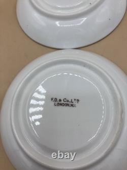 P Mallory & Son in Bath. We suspect this set is from the early 1900s. Item is in good used condition considering age. Saucers have some rubs to gilt edges and to branding on base but no chips, cracks or crazing. They are a little dull / grubby in places.