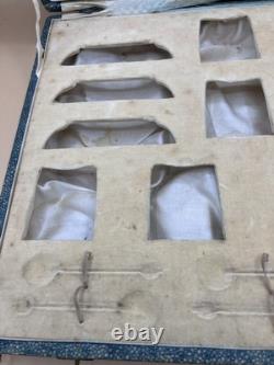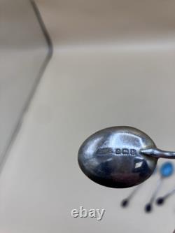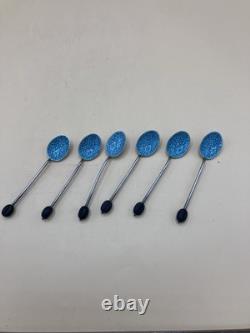 Spoons are sterling silver with hallmarks - flower, lion, F. The enamel is excellent although the silver could do with a good polish. Please note the colour of the set is a lovely turquoise - the photos seem to appear a slightly darker blue. The box is shagreen on wood.