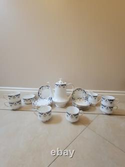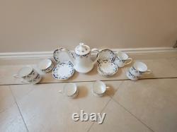 Experience the elegance of British teatime with this exquisite 21-piece Paragon china tea set, featuring a stunning combination of gold, blue, and white. Crafted in the heart of England, the set is a testament to timeless design and fine craftsmanship, perfect for adding a touch of sophistication to any table setting. The collection includes a milk jug, sugar pot, tea pot, and six each of saucers, side plates, and tea cups, all made from the finest bone china.
