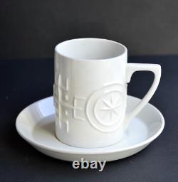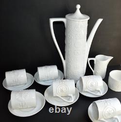 Vintage TOTEM coffee set by Portmeirion England, designed by Susan Williams-Ellis in 1961. The set is comprised of 1 tall, slim coffee pot with lid, 6 saucers, 6 coffee cups, 1 creamer and 1 sugar bowl. The set is in good vintage condition, with some discolouration and / or crazing which does't impact on its usage or aesthetics. One cup has a tiny burst glaze bubble and another one a tiny chip, in both cases on the base (see last photo). Te creamer and the sugar bowl are in pristine, as new, condition.