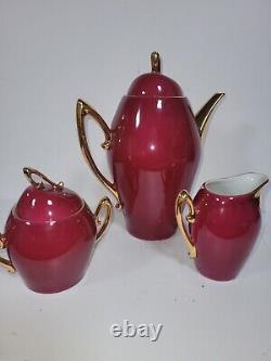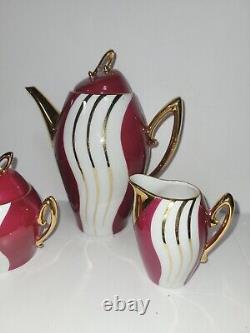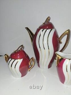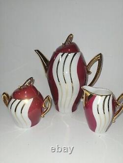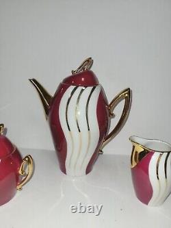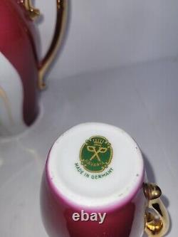 Avec un magnifique motif harlequin en rouge, or et blanc, cet ensemble de cafetière ne manquera pas d'attirer les regards. L'ensemble comprend une cafetière qui mesure 19,7 cm de hauteur et 16,5 cm de largeur, parfaite pour servir le café à vos invités ou se faire plaisir lors d'un paresseux dimanche matin. Fabriquée en Bavière, en Allemagne, en 1950, cette cafetière originale est en porcelaine de haute qualité et présente une finition brillante.