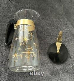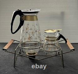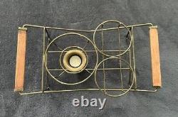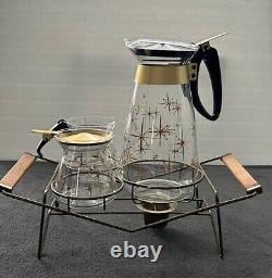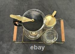 Comprend une carafe à café, un pot à crème, un sucrier, un plateau et un réchaud avec une bougie. Bord en bois sur le plateau.